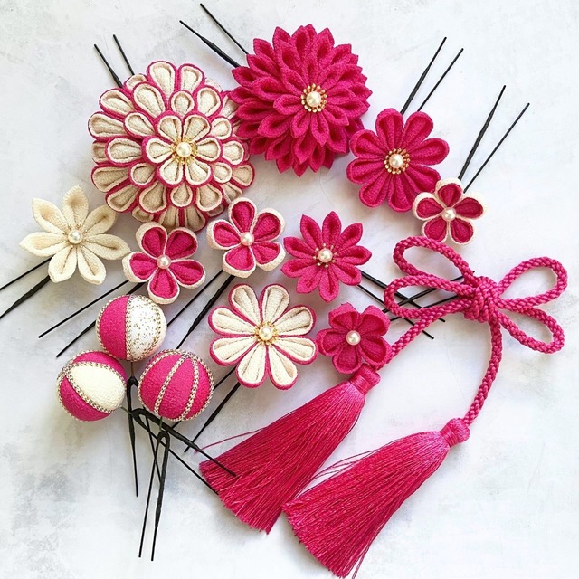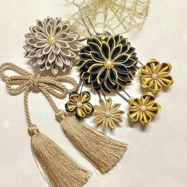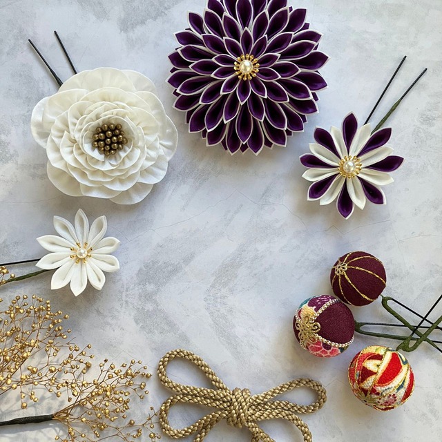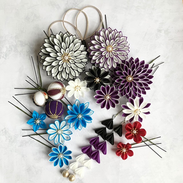 シャープなラインがでる羽二重生地の褐(黒)、胡紛(白)、本緋(深紅)、瑠璃(水色)、菫(紫)の生地を使用。二重剣つまみのダリア3つをベースにセットを構成。 組み合わせを変えることで、前撮り、当日、卒業式にもイメージを変えてアレンジ可能なセットになりました。 羽二重の生地は薄い生地なので独特の透明感があり品よく可愛らしい印象。洋装にも合わせやすいのも特徴です。 大ダリア 直径8センチ 1個 中ダリア 直径7センチ 2個 下がり(褐・菫・胡紛)長さ12センチ 1個 中サイズの花 直径4~5センチ 7個 小サイズの花 直径3~3.センチ 3個 輪型の飾り 1個 玉飾り(中1・大2)3個 黒の化粧箱に入れ、ヤマト便にてお届けいたします。 このたびは、仕上がりイメージ、色の組み合わせ、パーツの希望の質問にも迅速に対応いただきありがとうございました。 豪華なセットをご依頼いただき、楽しみながら作りました。素敵なご縁に感謝です。