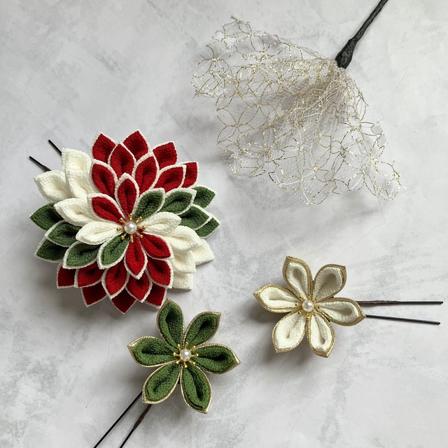 成人式に合わせて、深赤、松葉、純白3色をベースに、ゴールドも加え組み合わせた髪飾りとチュールレースのセット。 大きめのダリアは希望のお色で二重剣つまみ。 直径約8センチで存在感ある仕上がりに仕立てました。 小さめの花はゴールドラメの生地でちりめん生地を縁取っています。 直径は約4.5センチサイズ。 チュールレースは、ゴールドと白を組み合わせたものです。 花数は少ないものの、厳選した和の3色により、個性的で華やかなセットになったと思います。 簡易梱包の宅急便コンパクトにてお届けいたします。 希望イメージを共有できたこと、色味やパーツの確認などの質問にもすぐ回答していただけたこともあり、通常よりも短期間で仕上げることができました。ありがとうございました。 ------------------------------------------- 髪飾りお届け後に着用画像を送ってくださる方に、10%の割引を実施しております。 ご協力いただけます場合には、下記クーポンコードをご入力の上、ご注文ください。 クーポンコード: fleurrire2025