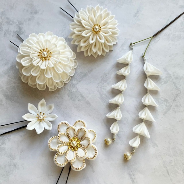 清楚で上品な雰囲気をまとえる、白のつまみ細工髪飾りセットです。 オフホワイトの優しい色合いのキュプラ地を使い、ダリア(丸つまみ・剣つまみ)、金縁の丸つまみ花、桔梗のようなお花、藤のような下がりまで、すべて同じ布で仕立てました。統一感のある仕上がりで、花芯にはゴールドとパールを添え、上品な華やかさをプラスしています。 白の髪飾りは振袖や袴の色を選ばず、どんな和装にも自然になじみます。成人式や卒業式、前撮りなど特別な日に「清楚で大人っぽい装い」を叶えたい方にぴったりです。 特に白い袴や淡い色合いの振袖コーデには相性抜群。髪に清らかな輝きを添え、写真映えする凛とした美しさを演出してくれます。 一生に一度の晴れの日を、自分らしく上品に彩りたい方におすすめの髪飾りです。