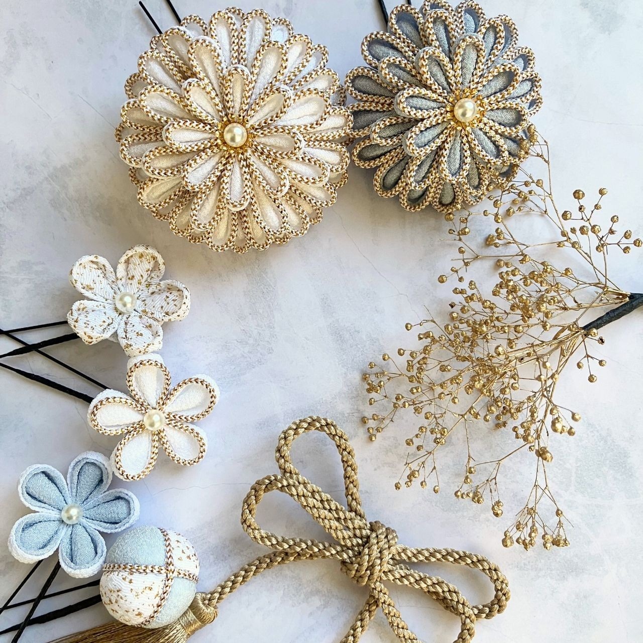 白×ゴールド、つまみ細工、落ち着いたダリアや椿など和テイストの髪飾りがよく合います。