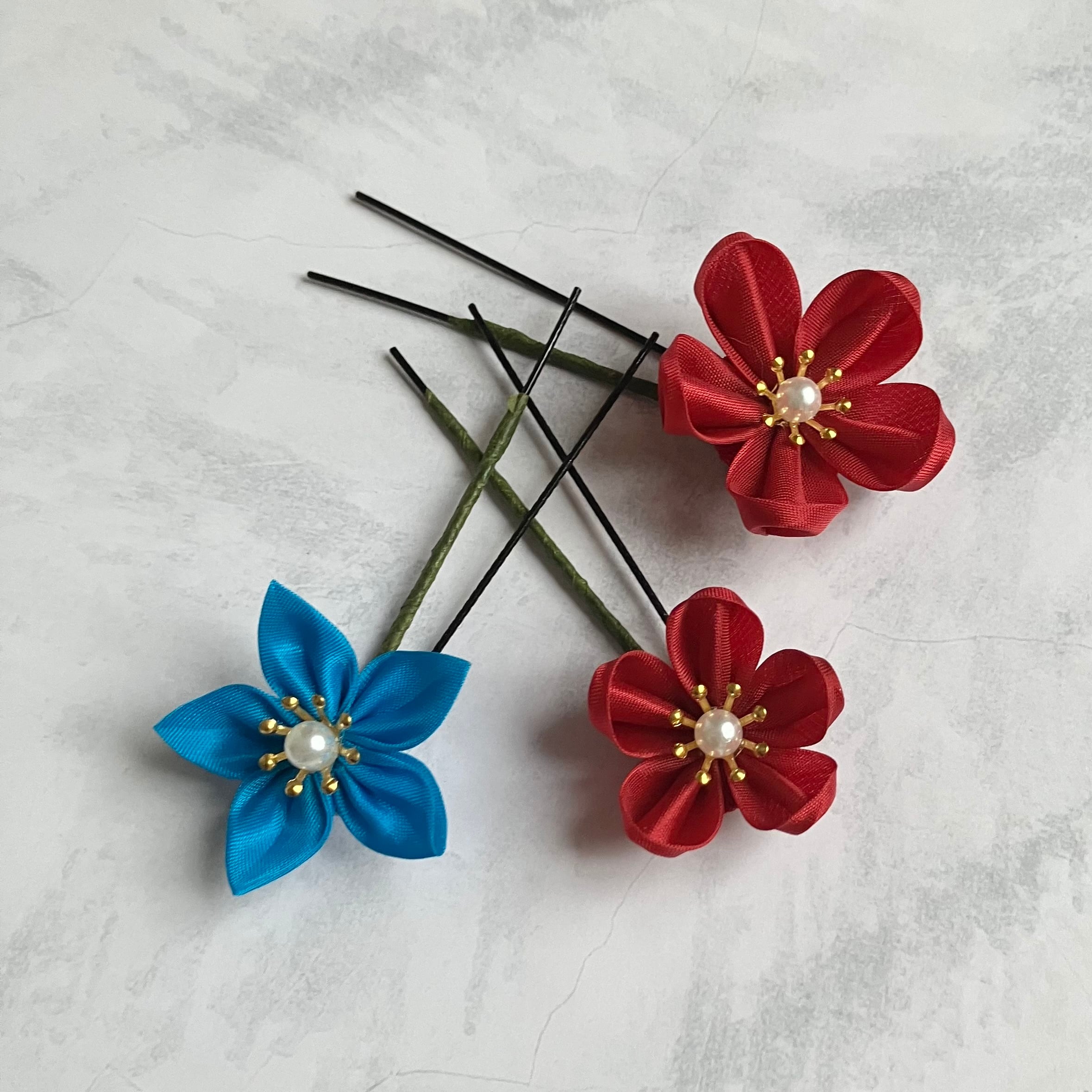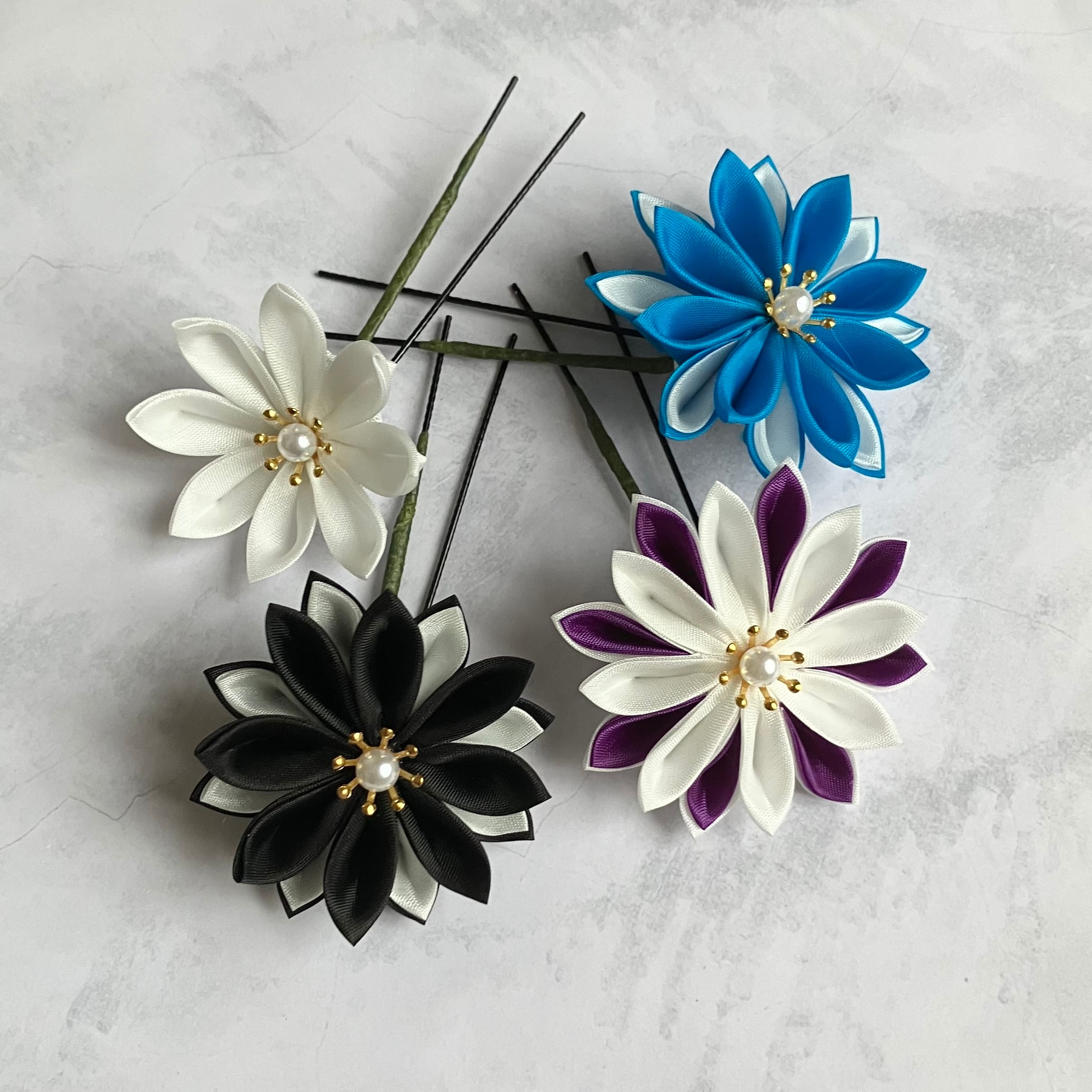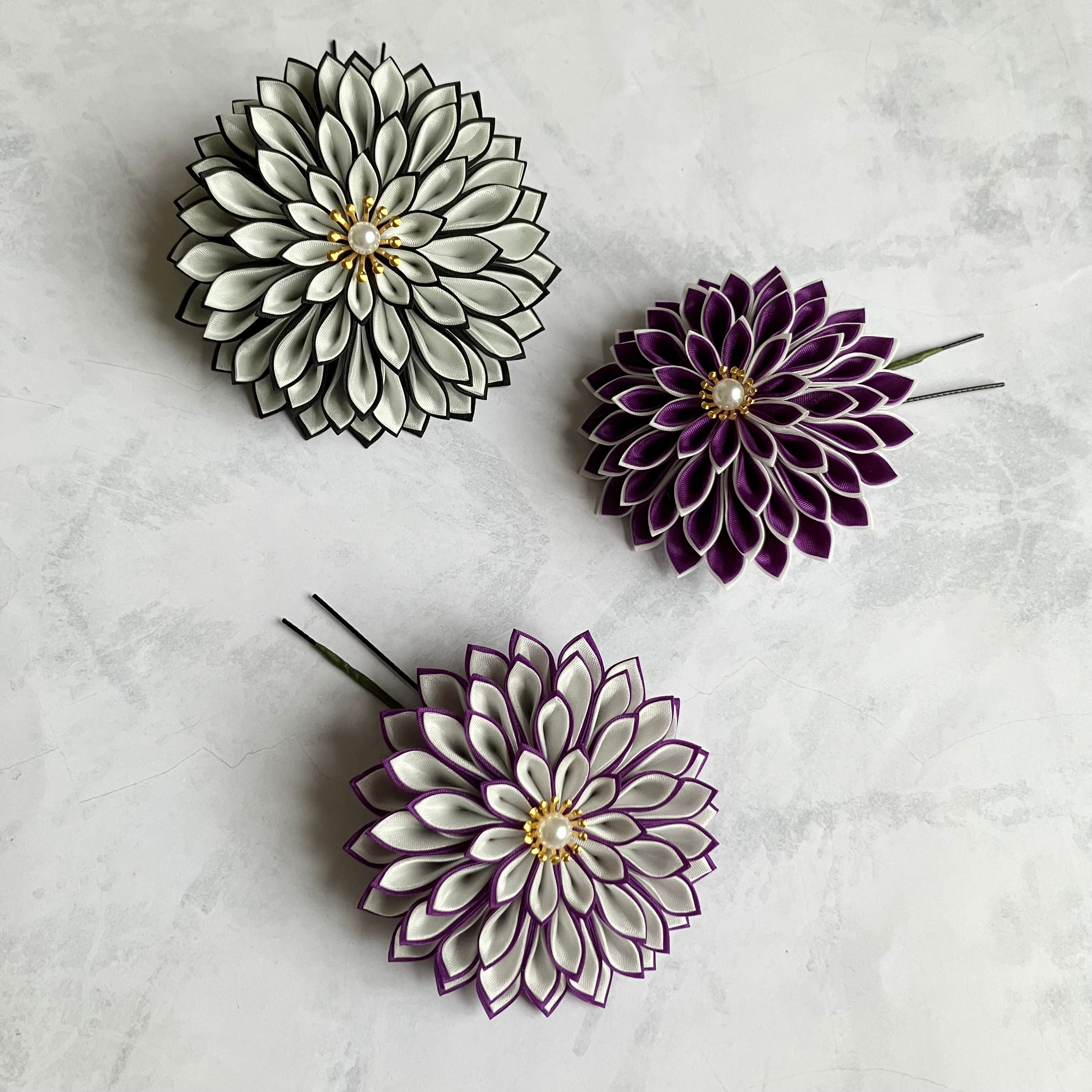 シャープなラインがでる羽二重生地の褐(黒)、胡紛(白)、本緋(深紅)、瑠璃(水色)、菫(紫)の生地を使用。二重剣つまみのダリア3つをベースにセットを構成。