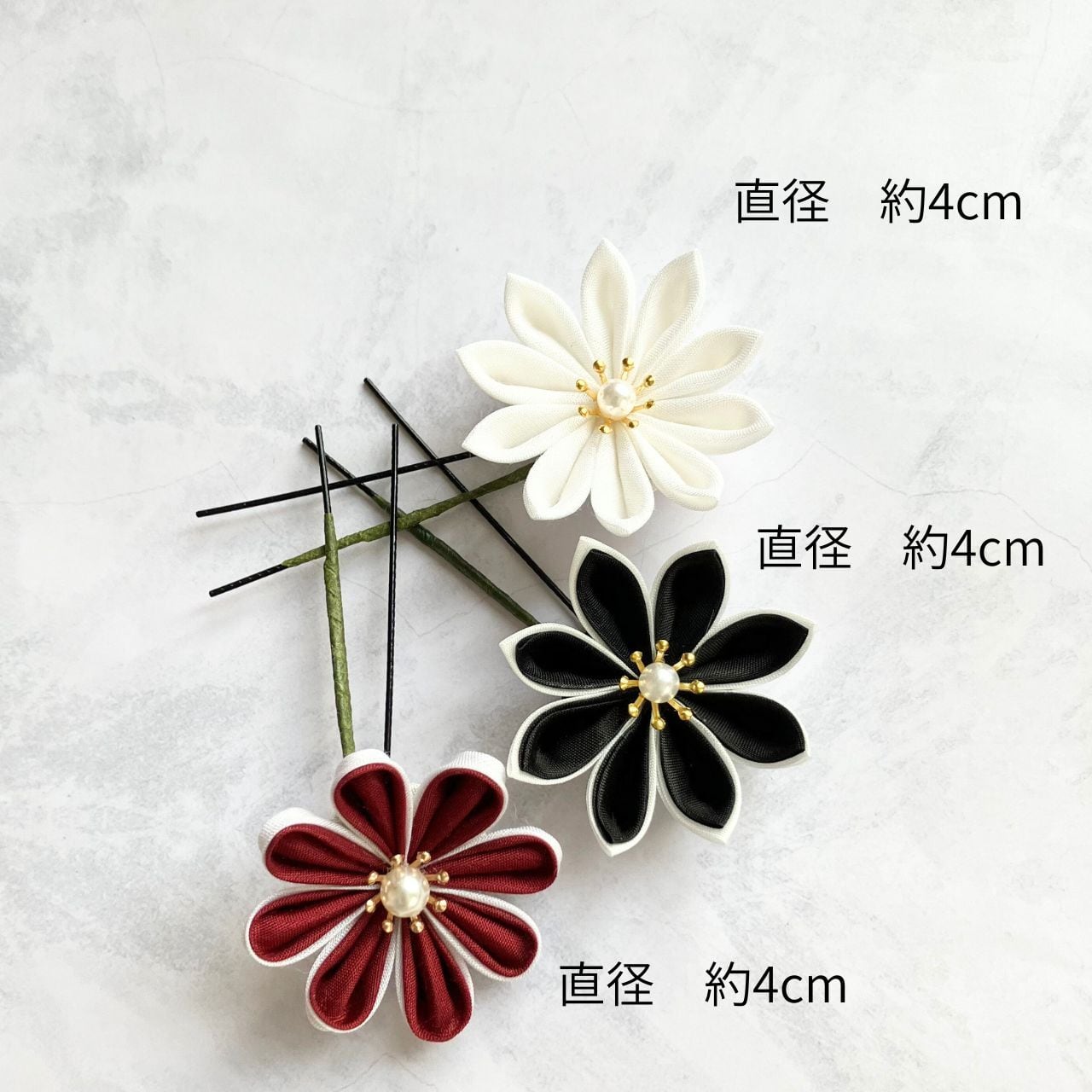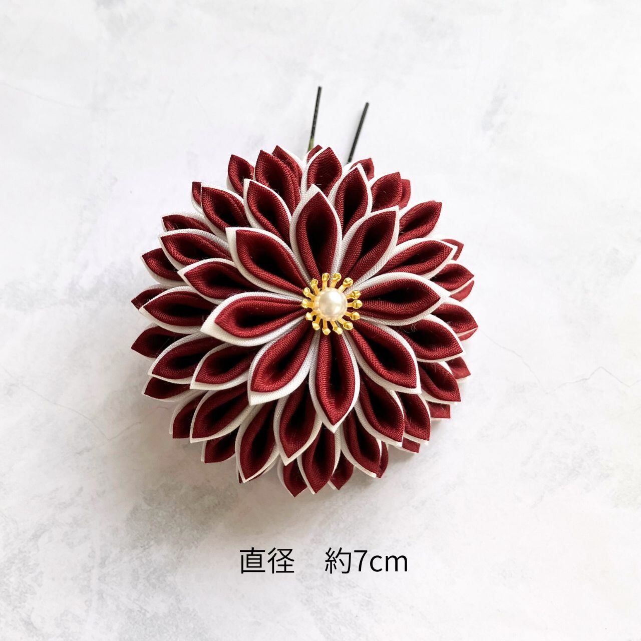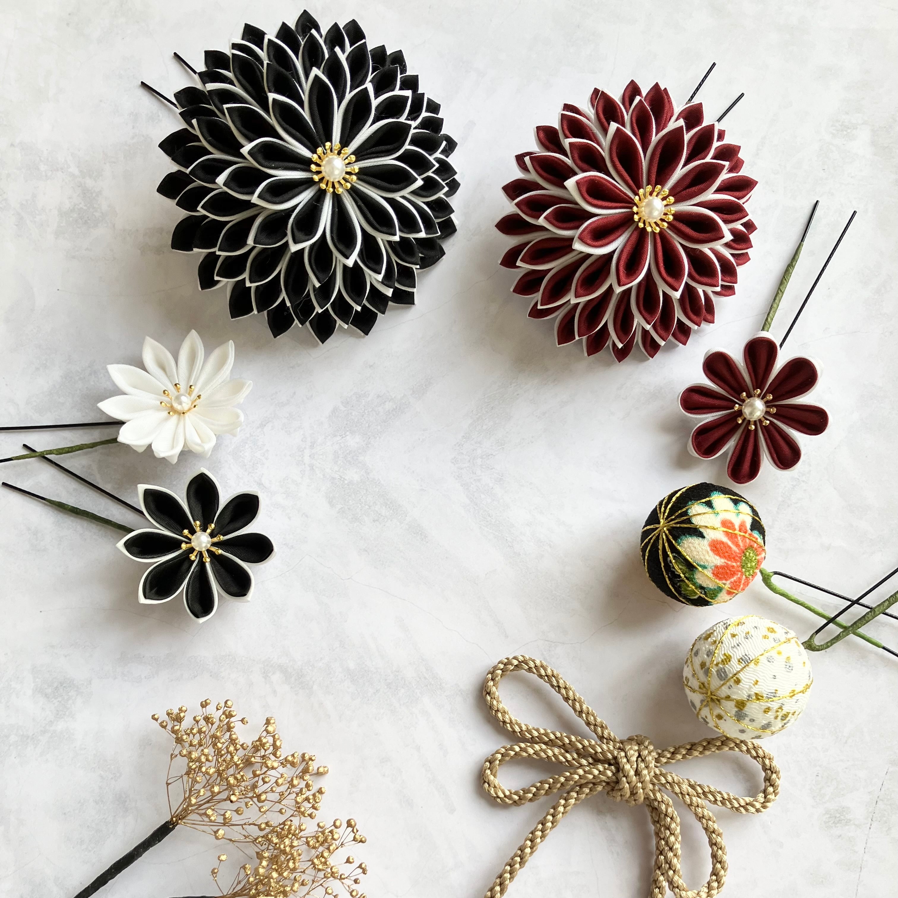 深みのある深紅と黒を組み合わせた、強い印象や艶やかさを持たせられる配色のつまみ細工髪飾りセットです。