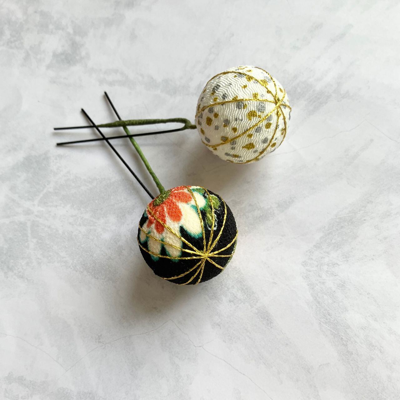 存在感のある黒の二重剣つまみと、深紅の二重剣つまみで、気高く華やぐ髪飾りに仕上げました。