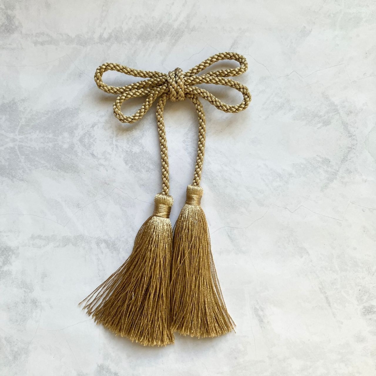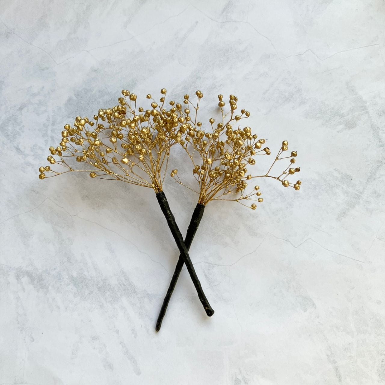 同系色の小花を3つ、ゴールドコーティングのカスミソウやゴールド系のタッセル、2つの玉飾りをプラスし、特別な日の装いを豪華に彩ります。