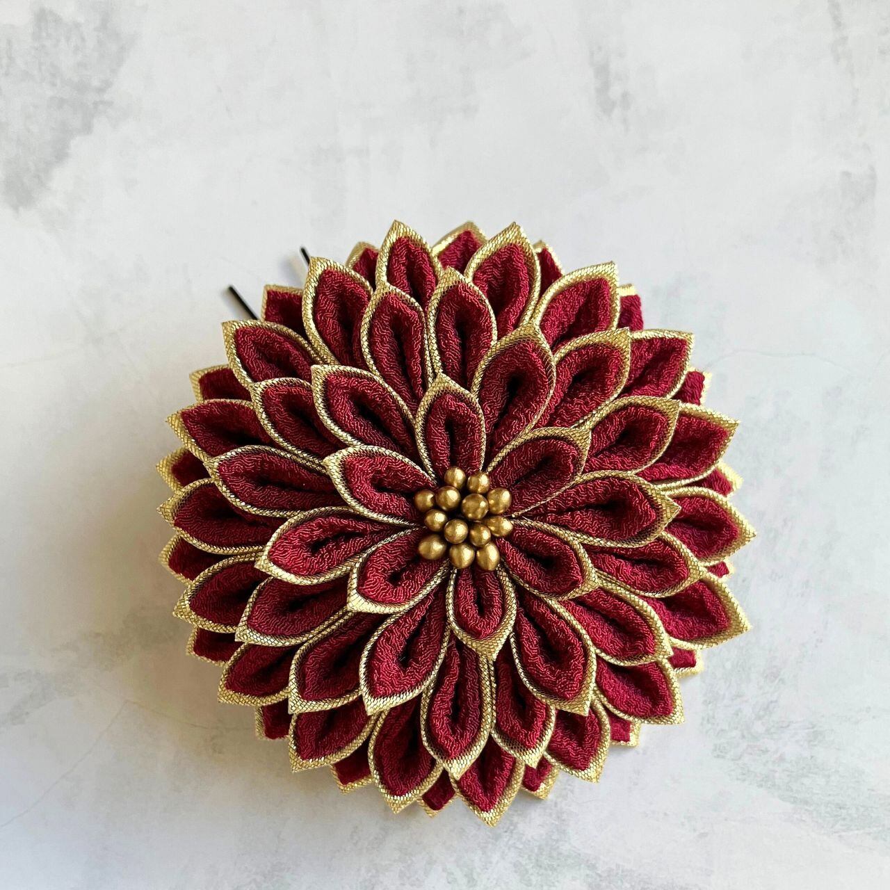 大きめのダリアはボルドー×ゴールドで二重剣つまみ(直径 約8㎝)